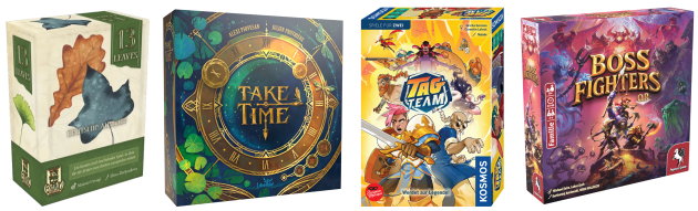 Besprochen wurden heute: „13 Leaves“ von Masato Uesugi, erschienen bei Cranio Creations, „Take Time“ von Alexi Piovesan und Julien Prothière, erscheinen bei Libellud, „Tag Team“ von Gricha German und Corentin Lebrat, erschienen bei Kosmos und „Boss Fighters QR“ von Michael Palm und Lukas Zach, erschienen bei Pegasus Spiele.