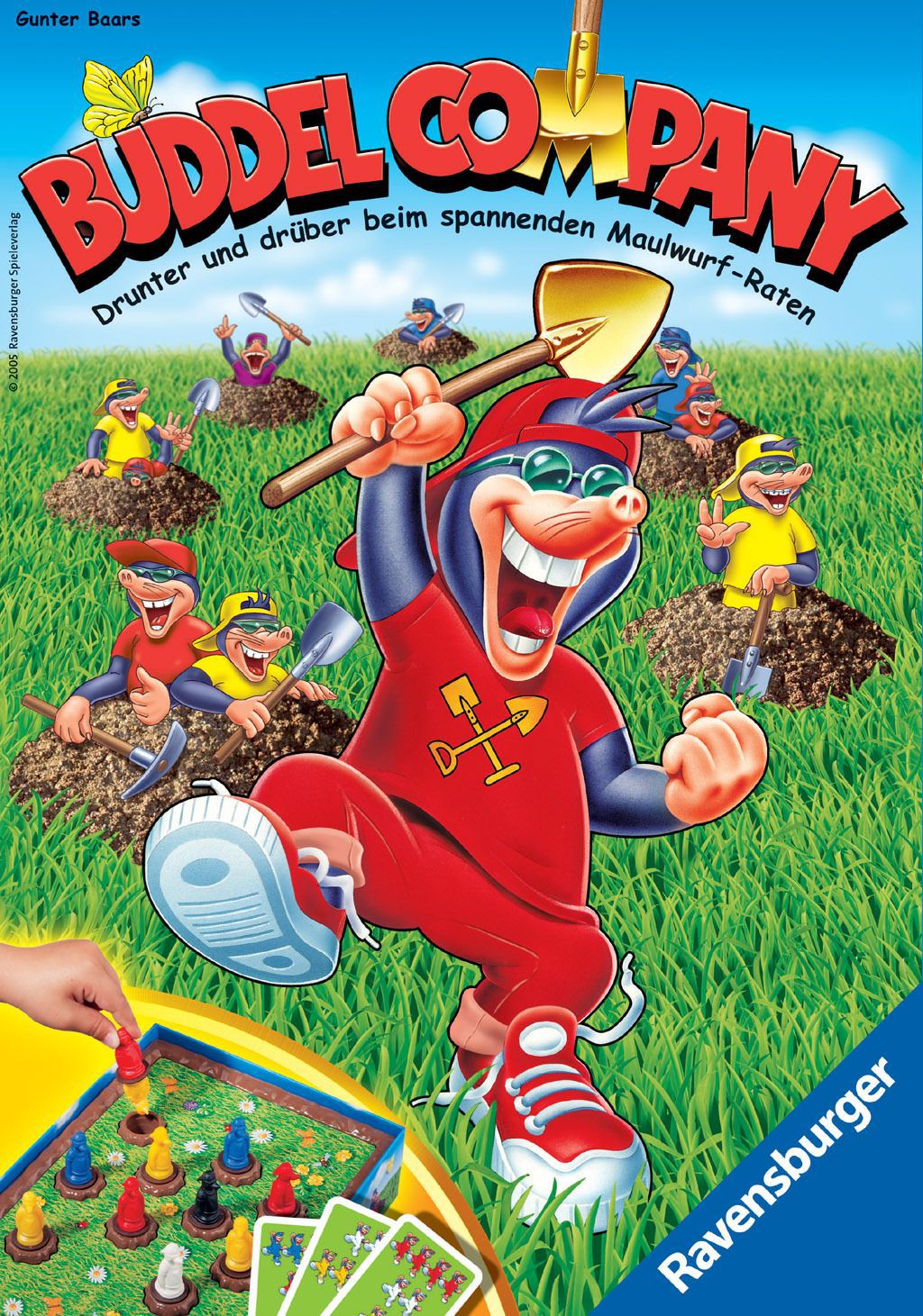 Wo stecken denn nur die frechen bunten Maulwürfe? Paarweise buddeln sie sich in die Wiese. Nur einer guckt jeweils aus dem Spielplan, der andere ist darunter versteckt. Die Spieler müssen sich merken, wo die roten, grünen, blauen und weißen Maulwürfe abgetaucht sind. Wer an der Reihe ist, dreht genau drei Maulwürfe um. Stimmen danach die Farben der sichtbaren Maulwürfe mit einer Aufgabenkarte überein, bekommt er die Karte und darf eine neue ziehen. Je nach Fähigkeit und Alter werden die leichteren oder schwereren Aufgaben gewählt. Nicht selten fordern dabei die Kinder ihre Eltern und Großeltern mit Erfolg heraus.