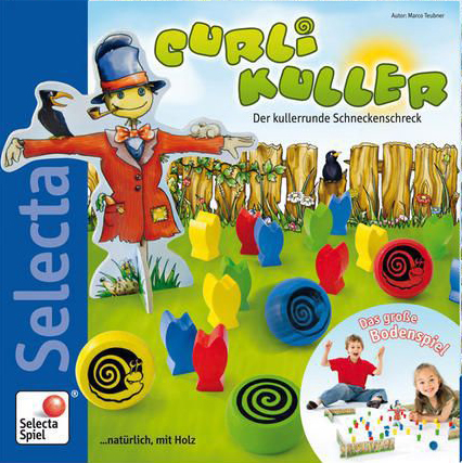 Kegeln nach Schneckenart. – Wie groß bei „Curli Kuller“ das Spielfeld wird, entscheiden die Mitspieler selbst, indem sie mit Zaunteilen Umrisse und Ausdehnung eines (Spiel-) Gartens festlegen. Die in vier verschiedenen Spielerfarben zur Verfügung stehenden Salatpflanzen werden gut gemischt im Garten verteilt. Zum Schutz der zarten Pflänzchen wird eine Vogelscheuche aufgerichtet. Aber auch Nichtgärtnern dürfte klar sein, dass sich davon zwar gefiederte Räuber abschrecken lassen, nicht aber jene listigen Schnecken, die sich den Spaß erlauben, in ihren Häusern über eine Kullerrampe in den Garten zu purzeln und dort die Salatpflanzen schlichtweg zu überrollen. Ziel der Spieler ist es, möglichst nur Salatpflänzchen der eigenen Farbe umzukegeln. Nur diese darf man nämlich aus dem Garten entfernen und damit die eigene Schneckenfamilie glücklich machen. Wer Salate in den Farben anderer Spieler umkullert, muss diese an die entsprechenden Spieler abgeben und hilft ihnen also praktisch, ihrerseits möglichst schnell viele Pflanzen der eigenen Farbe aus dem Garten zu holen. Wer zuerst acht seiner Pflanzen erkullert hat, gewinnt. Die Schnecke über die Kullerrampe zu rollen erfordert Geschick und ein gutes Auge. Das animiert sowohl Kinder als auch Erwachsene und erzeugt gute Laune. Gespielt werden kann übrigens auch auf dem Boden.