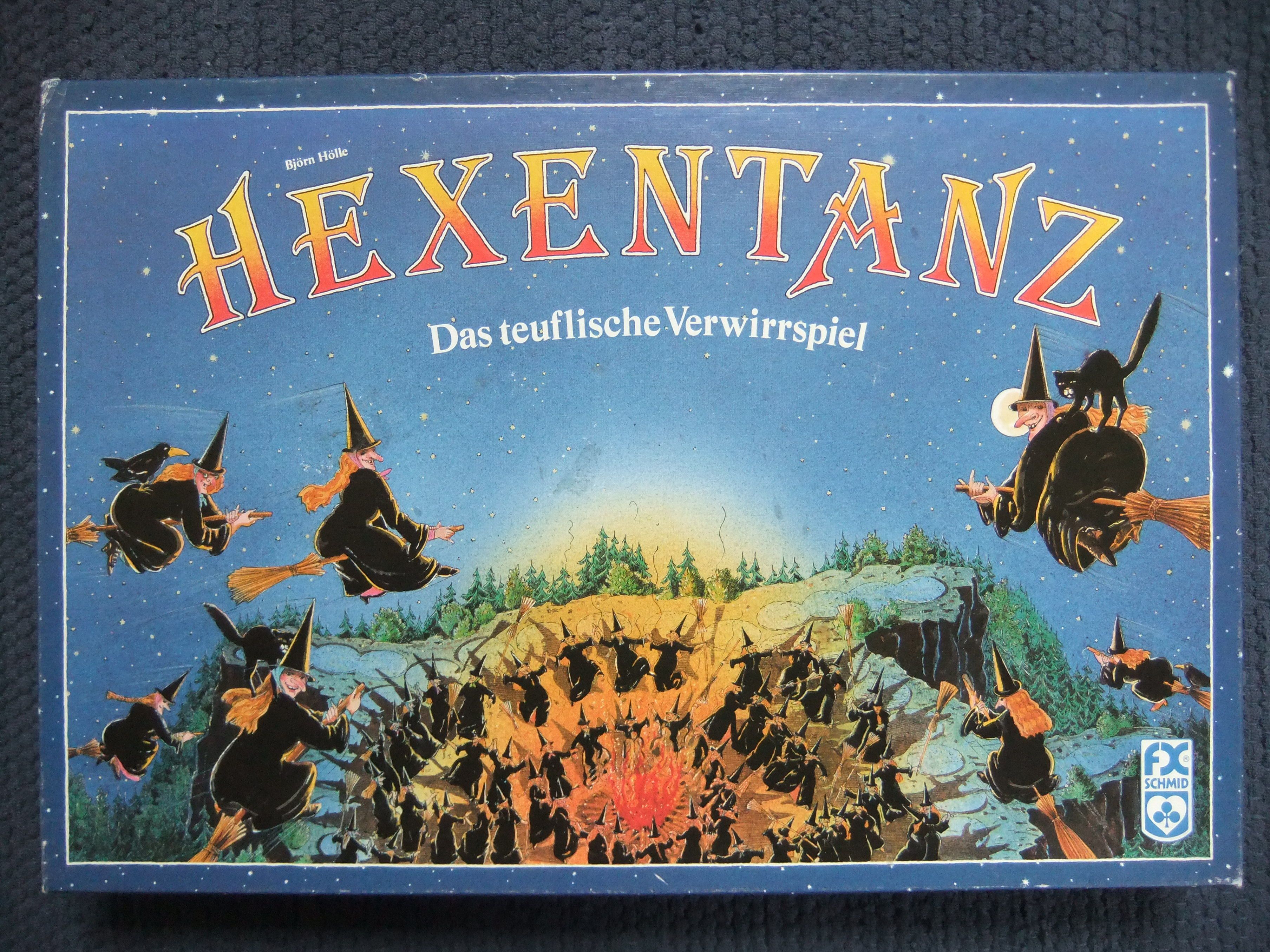 In der Walpurgisnacht tanzen die Hexen in wildem Reigen vor und zurück auf dem Blocksberg. Sie werden auf ihre Startfelder gesetzt, und jeder Spieler muss versuchen, die Seinen über einen Rundkurs als Erster ins Ziel zu würfeln. Trotzdem ist HEXENTANZ kein primitives Würfelspiel! Die Hexen sind nämlich alle in schwarze Gewänder gehüllt und nur auf der Unterseite farbig markiert. Da jede Hexe von jedem Spieler gezogen werden darf, verliert man schnell die Übersicht. Nachsehen, welche Farbe eine Figur hat, darf man nur selten. So starren die Spieler verzweifelt auf den Kreis schwarzer Hütchen und versuchen sich zu erinnern, welche denn nun die eigenen Hexen verbergen. Bringt man nämlich eine vermeintlich eigene Hexe ins Ziel, stellt sich dort vielleicht heraus, dass sie einem Mitspieler gehört. Der freut sich dann teuflisch, denn sie wird sofort in sein Ziel gestellt. HEXENTANZ ist ein köstliches Verwirrspiel für Gedächtniskünstler, die beim wildesten Hexengerangel nicht den Überblick verlieren.