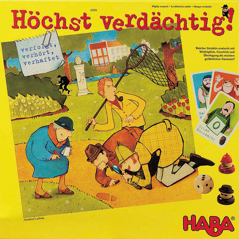 HÖCHST VERDÄCHTIG ist ein dreidimensionales Spiel mit einem besonderen Kniff, der die Feinmotorik der Kinder unterstützt. Das flache Spielbrett liegt nicht einfach auf dem Spieltisch, sondern auf einem Fuß, der ermöglicht, dass es auf alle vier Seiten gekippt werden kann. Auf dem Spielplan sind Blumenbeete, Teiche, Statuen oder Bänke leicht höher als die Wege, die vier Detektiven und einer Ganoven-Figur als Bewegungs-Spielraum dienen. Drückt man auf einen der markierten Punkte an den vier Seiten des Spielfeldes, neigt sich dieses, so dass alle Spielfiguren bis zum nächsten Hindernis rutschen und dort stehen bleiben.