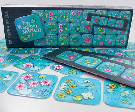 IM WASSERGARTEN liegen 48 Plättchen mit ähnlichen Motiven offen aus. Dazu gibt es zwölf Karten mit jeweils vier dieser Motive. Jeder bekommt pro Runde eine Karten und versucht, als Erster seine vier passenden Plättchen zu finden. Was stimmt, bringt Punkte. Wer die meisten erzielt, gewinnt dieses gelungene, schnelle Spiel, bei dem es darauf ankommt, sich zu konzentrieren, Muster zu erkennen und sich Merkmale strategisch einzuprägen.