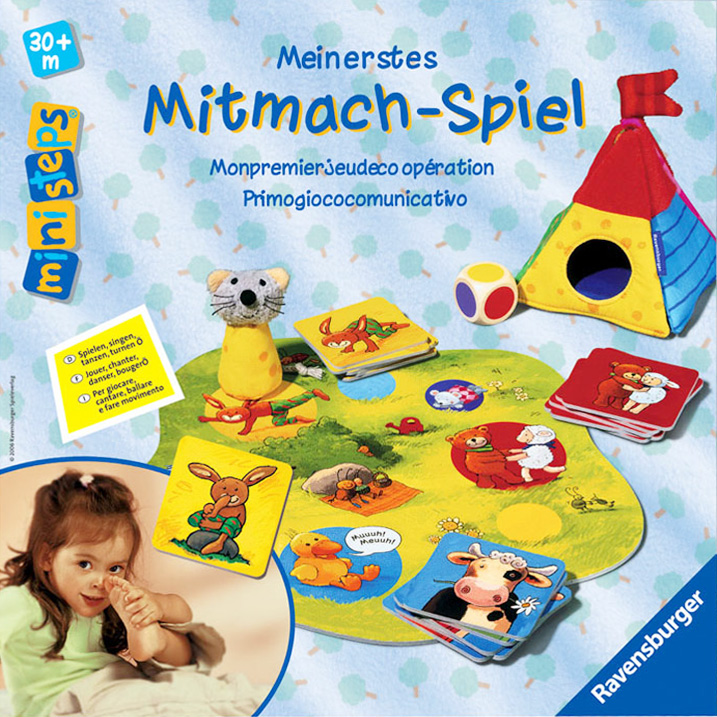 Der Titel sagt bereits, worum es geht: ein allererstes Spiel, bei dem das Kind begeistert spielt und zugleich lernt, sich an einfache Regeln zu halten. Dabei muss aber ein Erwachsener helfen und mitspielen. Der Farbwürfel bestimmt, wie weit das putzige Plüschmäuschen über den Spielplan läuft. Gut erkennbare, farbenfrohe Bildkarten geben leicht verständlich kleine Aufgaben vor: Das Kind macht Tierlaute nach, veranstaltet lustige Turnübungen oder tanzt, singt und spielt. Für jede erfüllte Aufgabe bekommt es ein weiches Stoffteil. Daraus baut es mit Klettverbindungen ein kuscheliges Zelt, in das das Mäuschen schließlich hineinschlüpft. Das Spiel ist kindgerecht gestaltet. Bei den Bewegungs- und Sprachelementen steht der Lerneffekt unaufdringlich im Hintergrund.