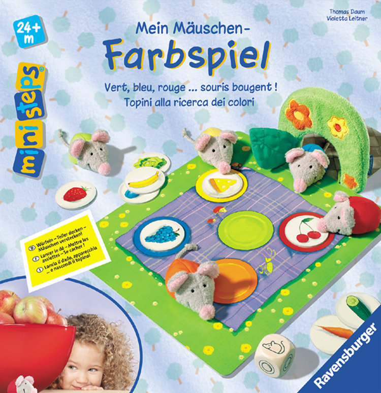 Fünf farbige Stoffmäuschen treffen sich am Spielbrett, auf dem eine Picknickdecke abgebildet ist. Daneben befindet sich ein Mauseloch aus weichem Stoffmaterial. Sobald ein Kind das Mäusesymbol würfelt, zwängt sich ein Stofftier durch dieses Loch in die „reale Welt“. Dort sucht das Kind ein Versteck für sein Nagetier. Dabei muss es im Zimmer einen Gegenstand in der Farbe der Maus finden und dann das Tier darunter oder dahinter legen. Wer einen „Teller“ würfelt, deckt ein Futterplättchen auf. Auch hier muss die Farbe richtig zugeordnet werden, indem etwa die Banane auf den gelben Teller kommt. Wenn alle Mäuse gegangen sind und auf jedem Teller das Futter liegt, holen die Kinder die Nagetiere aus ihren Verstecken und das Picknick beginnt. Ein tolles Spiel, bei dem die Kleinsten in Bewegung bleiben.