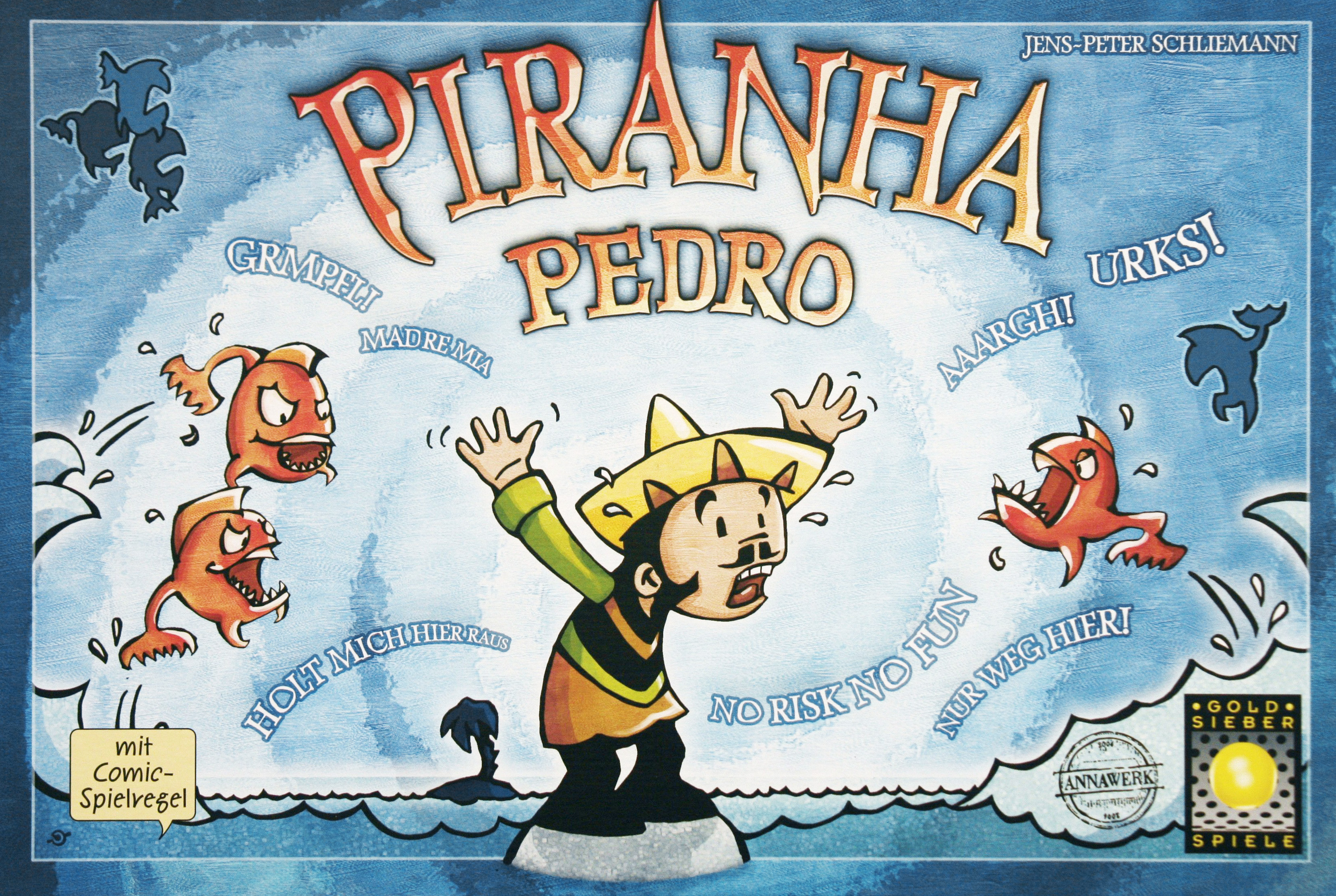 Mitten auf einer Insel im Amazonas sitzt Pedro – einsam und verlassen, umgeben von gefräßigen Piranhas. Um ihn sicher über das Wasser zu führen, legen die Spieler Steine auf das Spielbrett. Dazu spielen sie gleichzeitig und verdeckt Karten aus, die Richtung und Anzahl der Schritte vorgeben. Doch Vorsicht: Der Vorrat an eigenen Steinen ist begrenzt! Wem Pedro bei diesem Hin und Her das zweite Mal ins Wasser fällt, verliert. Die Spielsteine aus Carrara-Marmor und die innovative Spielregel mit ihrem Comic-Stil runden dieses rasante Spiel ab, bei dem Schadenfreude groß geschrieben wird.