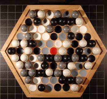 Die perfekte Umsetzung einer Spielidee in eine ansprechende Materialgestaltung ist die Stärke des Kleinverlages Theta Promotion. Die meisten dieser Spiele fallen durch ihr ungewöhnliches und Aufmerksamkeit erweckendes Design auf. So auch der PUSHER. Spielbasis ist eine sechseckige Holzplatte, in die 91 symmetrisch angeordnete Mulden eingelassen sind. Jeder Spieler besitzt zu Beginn 17 Holzkugeln einer Farbe und versucht, diese auf dem Spielfeld unterzubringen. Die einfache Spielregel besagt, dass, sobald zwei Kugeln nebeneinander liegen, der nächste Mitspieler ein Dreieck bilden muss. Der darauf folgende Spieler muss jetzt „pushen“, das heißt, er muss seine Kugel so in das Dreieck drücken, dass mindestens eine Kugel frei aus ihrer Mulde kullert. Rollen gepushte Kugeln dabei auf gleichfarbige Felder, werden sie herausgenommen. Der Spieler darf so lange weiterspielen, bis eine eigene Kugel auf ein gleichfarbiges Feld läuft. Fingerspitzengefühl, wie stark und in welche Richtung der Spieler die Kugel dabei zu lenken vermag, ist von spielentscheidender Bedeutung. Die originelle Idee begeistert und bietet dem breiten Publikum dauerhaften Spielspaß. Das Spiel ist ansprechend und aufwändig fast vollständig aus Holz gefertigt.