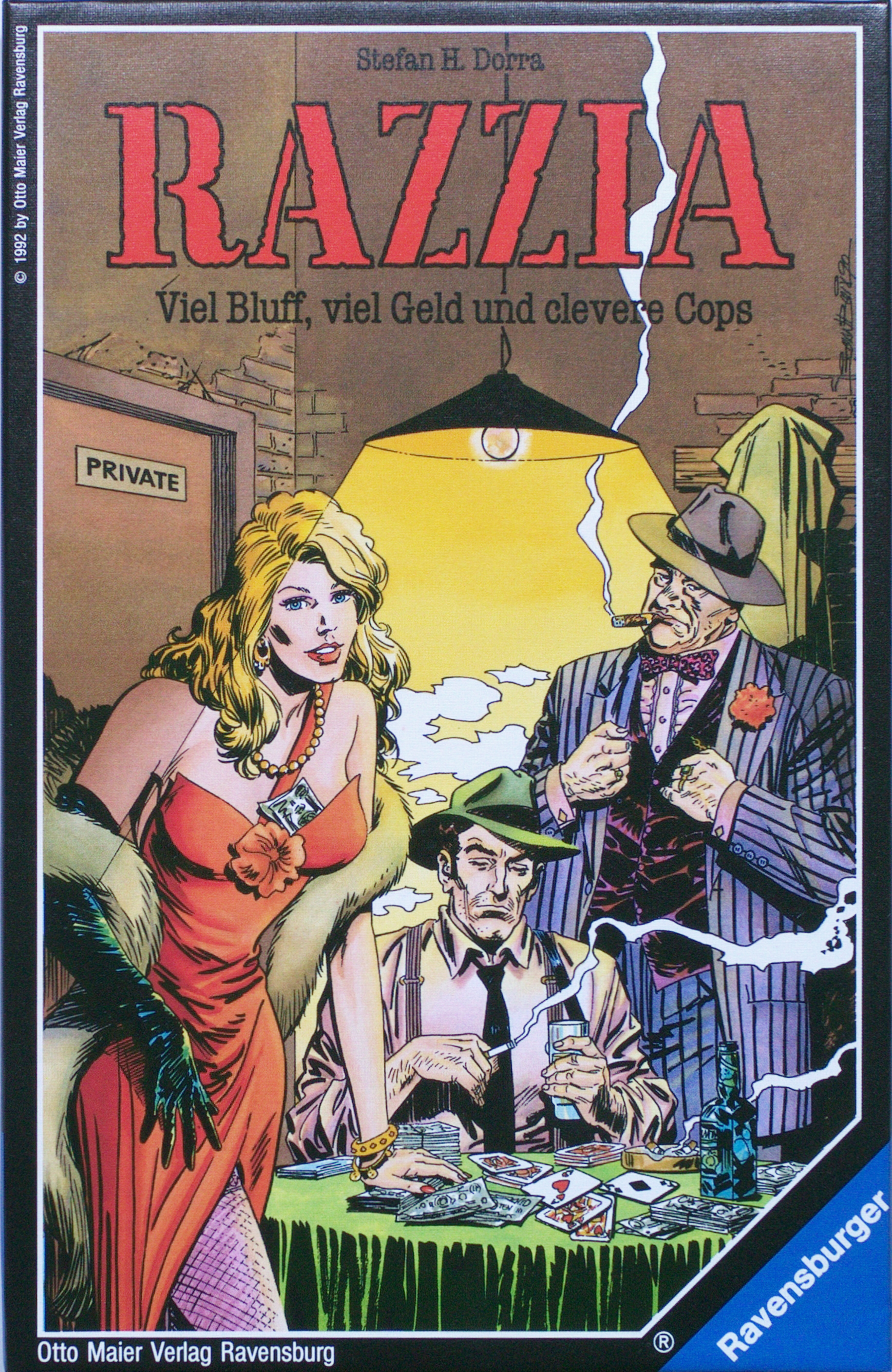 Im Hinterzimmer der Havanna-Bar geht es um viel, viel Geld. Eine kesse Blondine zwinkert Zinker-Joe auffordernd zu. Da tönt ein Schrei durch die Kaschemme: „Polizei! Eine Razzia!“ Augenblicklich sind die Pokerkarten verschwunden. Jeder rafft Dollars und macht sich aus dem Staub. Doch ehe Zinker-Joe verduften kann, greift der Cop vom 41. Revier zu… Vor sechs Spelunken liegt jeweils ein Haufen Geld. Jeder Spieler legt verdeckt eine Karte ab. Die Karten zeigen entweder einen Zocker oder einen Polizisten und werden gleichzeitig aufgedeckt. Der Farbrand bestimmt, welche Karte zu welcher Bar gehört. Ein Zocker allein darf den Geldhaufen in der Bar einstreichen. Ein Polizist in der gleichen Bar verhaftet den Zocker und nimmt ihm das Geld ab. Ein Polizist allein hingegen geht leer aus. Spannend wird es, wenn sich mehrere Polizisten oder mehrere Zocker um die Beute streiten. Sie können sich gütlich einigen, oder sie tragen ein Würfel-Duell aus. Ein kleines, rasantes Spiel in bester Comic-Manier. Es geht vor allem darum, die Vorgehensweise der Mitspieler richtig einzuschätzen, manchmal bescheiden einen kleinen Gewinn abzustauben und dann wieder eiskalt und frech zuzuschlagen.