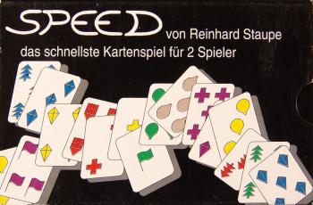 Man nehme einen Satz von 60 Karten und teile ihn unter den beiden Spielern auf. Jeder nimmt eine Karte und legt sie verdeckt auf den Tisch. Drei Karten darf jeder Spieler von seinem Stapel auf die Hand nehmen. Auf ein Startsignal hin werden die verdeckten Karten zugleich umgedreht. Jetzt geht es los, und zwar mit High-Speed. Die Karten zeigen sechs unterschiedliche Symbole in unterschiedlicher Anzahl und Farbe. Wenn auch nur ein Merkmal einer Karte auf der Hand mit einer der aufgedeckten Starterkarten übereinstimmt, darf man sie ablegen. Also Motiv auf gleiches Motiv, gleichgültig welcher Farbe und Zahl. Oder gleiche Farben aufeinander, ohne Rücksicht auf das, was die Karte sonst noch zeigt. Oder gleiche Anzahl, wobei es keine Rolle spielt, welche Farben oder welche Motive darauf sind. Das hört sich ganz einfach an und ist es im Prinzip auch. Aber es geht alles so furchtbar schnell. Man darf jederzeit Karten vom Talon nachziehen, aber nie mehr als drei Karten auf der Hand halten. SPEED ist aufregend. Da fliegen die Fetzen. Kaum hat man eine passende Farbe gesehen und greift nach der gleichen Farbe, liegen schon ganz andere Karten darüber, weil der Gegenspieler eine Übereinstimmung in Zahl oder Farbe gefunden hat. Bei guten Spielern ist der hektische Spuk nach einer halben Minute vorbei. Mischen, 30 Karten abzählen. Und schon geht es wieder los. Der Rekord liegt bei 21 Sekunden. Aber probieren kann man ja immer wieder mal, wie nahe man diesem Ziel kommt.