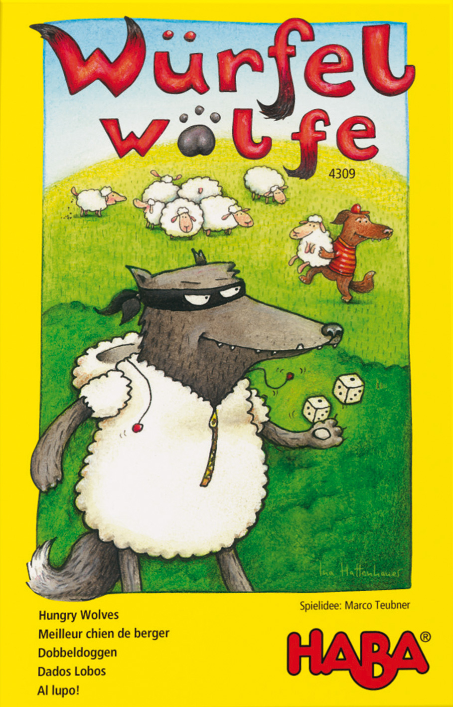 Von guten Hirten und bösen Wölfen. – Eine Hundemeute, die im Kreis über das kleine Spielbrett zieht, bewacht die in der Mitte liegende Schafherde. Alle würfeln gleichzeitig. Wenn der Würfel „Hund“ zeigt, bellt der Spieler und geht mit seiner Hundefigur einen Schritt nach vorne. Wer ein „Schaf“ würfelt ruft „mäh“ und bleibt stehen. Turbulent wird es, wenn ein Kind den „Wolf“ würfelt. Es springt auf und läuft einmal um den Tisch. Anschließend wird sofort weitergewürfelt. Sobald ein Hund die vor ihm laufende gegnerische Hundefigur eingeholt hat, ist das Spiel kurz unterbrochen. Für seinen erfolgreichen Schäferhund gewinnt das Kind einen Schafchip. Die Hunde werden wieder aufgestellt und die aufregende Hatz startet erneut. Weiterwürfeln und dann passiert alles wieder gleichzeitig: „Mäh“ oder „Wuff“ rufen und den Tisch umrunden. Der Würfelwettlauf endet, sobald ein Kind drei Schafe gewonnen hat.