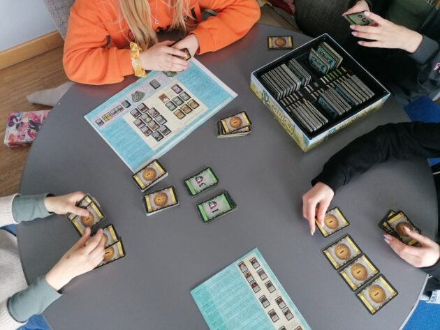 Zuerst haben wir uns alle Spiele angeschaut. In Kleingruppen wurden anschließend einzelne Spiele ausgewählt, ausgepackt und getestet. Dazu zählten unter anderem „Zug um Zug“, „Draftosaurus“, „Scotlandyard“, „Cascadia“, „Siedler“, „Just one“ und viele mehr.
