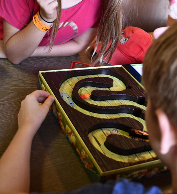 Anders als die Auftaktveranstaltung waren die monatlichen Spieletreffs (von Juni 2024 bis Mai 2025) weniger besucht. Es bildete sich eine Kerngruppe von 18 Personen. In den Wintermonaten wurde es mit Tee und Waffeln gemütlich; sobald es wärmer wurde, zog es die Kinder zum Spielen nach draußen; die Verweildauer an den Tischen sank. Grundsätzlich nutzten die Kinder das Angebot aber intensiv: Sie wollten oft länger als die Erwachsenen spielen und so ergaben stetig neue Spielkonstellationen. Durch den Schrank waren alle Materialien vor Ort; so gelang Durchführung auch in wechselnden Teams und mit geringem Aufwand. Das Team vergrößerte sich auf sechs Personen. Wir werden das Projekt fortführen und aufgrund der nachlassenden Nachfrage im Sommer auf die Wintermonate begrenzen. Der nächste Spieletreff findet im September statt.