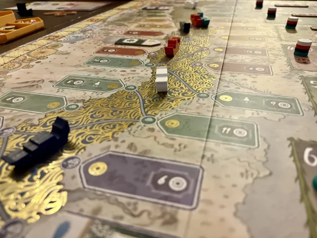 „Runde für Runde hängt alles an einem Würfelwurf“, so Stefan Gohlisch über das Spiel. „Dessen Seiten zeigen sowohl die bekannten Ziffern von 1 bis 6 als auch Symbole der Regionen entlang des Flusses. Drei Aktionen stehen zur Auswahl: Entweder wir fahren entsprechend viele Felder mit unseren Booten den Fluss entlang und nutzen den Bonus des Zielorts. Oder wir bauen am Ufer der passenden Region Gebäude, die in späteren Runden andere Boni generieren. Oder wir beliefern Kunden in den Regionen (was durch Karten symbolisiert wird und Ressourcen erfordert) und mehren dadurch unseren Einfluss. Ebenfalls spätestens nach der ersten Partie weiß man, wie fundamental wichtig das für die Endabrechnung ist.“