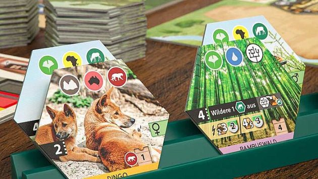 „Wir bauen Zoos. Mit großen sechseckigen Legeplättchen. ‚Artengarten‘ ist also ein Legespiel – und ein Puzzle. Die Plättchen meines Zoos beeinflussen sich auf verschiedene Weise gegenseitig. Das „Reptilienhaus“ etwa bringt Punkte für jedes direkt benachbarte Reptil, der „Alpensteinbock“ für eine möglichst große zusammenhängende Fläche aus Plättchen mit Gebirgssymbolen. Also will ich das entsprechend kombinieren“, erklärt Udo Bartsch das Spiel. „Insgesamt gibt es vier Aktionsarten, jeweils repräsentiert durch Kärtchen, die unterhalb meines Zooplans auf Plätzen mit Wertigkeiten von eins bis fünf liegen. Bin ich am Zug, erhalte ich zunächst ein Zooplättchen vom Markt. Wie groß meine Auswahl ist, wird durch die Position meiner Aktionskarte „Projekt“ bestimmt. Im Bestfall darf ich zwischen fünf Plättchen wählen, im schlechtesten Fall kriege ich einfach dasjenige, das schon am längsten im Markt rumliegt. Anschließend nutze ich eine meiner vier Aktionskarten. Liegt die an Position drei, hat meine Aktion die Stärke drei. Nach Ausführung rutscht die Karte zurück auf den schwächsten Platz, die anderen rücken auf.“