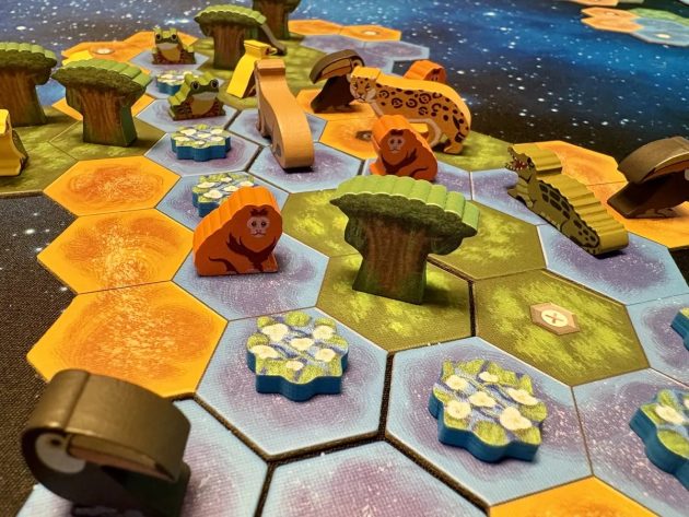 „Vor allem die Tiere sind es, die in ‚Life of the Amazonia“ Punkte zählen. Jedes der acht Tiere hat seine eigenen Bedingungen. Der Laubfrosch will eine private Wasserpflanze neben sich haben, dann zählt er vier Punkte. Der Ara zählt bis zu elf Punkte, abhängig von der Anzahl Bäume in seinem Wald-Lebensraum“, erklärt Udo Bartsch das Spiel. „Welche Ressourcen mir für den kommenden Zug zur Verfügung stehen, erfahre ich schon am Ende des vorherigen Zuges. Dann nämlich ziehe ich fünf Ressourcenchips aus meinem Beutel. Neben Obst, Blatt und Wasser gibt es noch Münzressourcen. Und jede dieser Ressourcen gibt es in Werten von bis zu vier. Höhere Ressourcen sind natürlich toller. Einen Ara könnte ich mit fünf Chips gar nicht bezahlen, wären alle meine Ressourcen nur Einer. Bin ich am Zug, investiere ich also meine gezogenen Chips: für Tiere, für weitere Landschaftsplatten, für Bäume, für Wasserblumen. Und auch für zusätzliche und bessere Chips.“