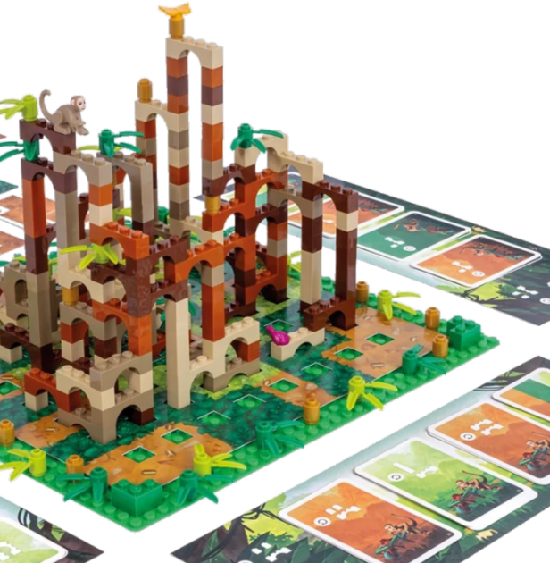 „Wir errichten einen Affenpalast. Wir verwenden die Steine in unserem Vorrat, um neue durchgehende Treppen anzulegen. Immer ausgehend vom Boden, so hoch wie möglich. Mit beliebig großen Stufen. Dank der Legosteine in vier unterschiedlichen Farben, die für das Spiel jedoch irrelevant sind, und Dekorationselementen entsteht nach und nach ein Gebilde, das gut zum Thema passt und vor allem stabil bleibt“, erklärt Karsten Grosser das Spiel. „Dabei kommt es – bei einem Bauspiel wenig verwunderlich – ja genau darauf an, die beste Option für seinen Zug zu finden. Desto mehr Bögen ich verbaue, desto stärkere Affenkarten erhalte ich, die wiederum den Steinenachschub steuern.“
