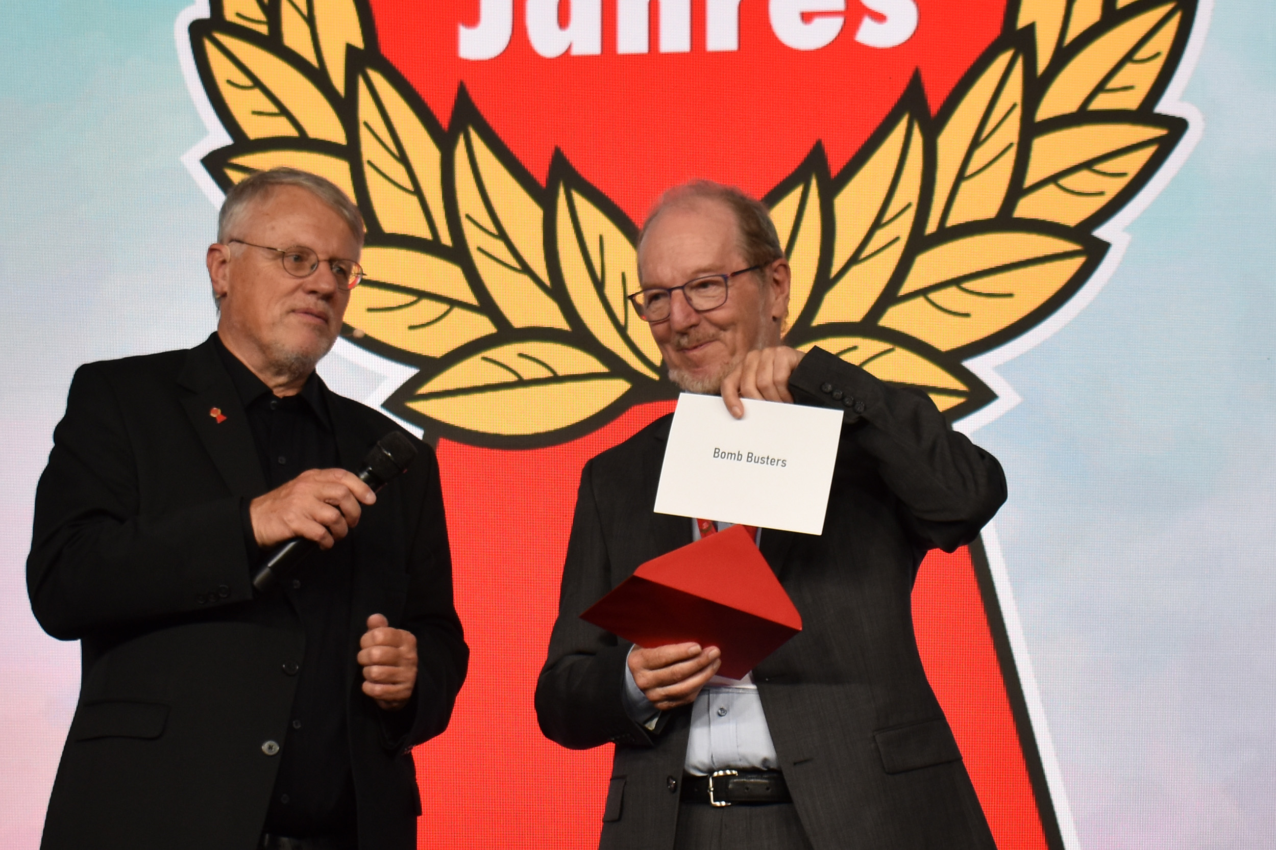 Im spannendsten Augenblick geht der Blick zurück. Als sie am größten ist, während der Preisverleihung zum Spiel, Kennerspiel und Kinderspiel des Jahres, kurz bevor „Bomb Busters“ von Hisashi Hayashi (Pegasus Spiele) zum Spiel des Jahres 2025 gekürt wird, erklärt Harald Schrapers, der Vorsitzende des Vereins Spiel des Jahres: „,Die Siedler von Catan‘ sind ein Meilenstein der Spielgeschichte.“ Das Spiel von Klaus Teuber wurde vor 30 Jahren zum Spiel des Jahres gekürt. „Das hat das German Game weit nach vorne gebracht“, so Schrapers. Den Umschlag mit dem Gewinnerspiel darf dann Jürgen Herz öffnen, Gründungsmitglied des Vereins. „Die Idee war eine Sache“, sagt er, „aber um das umzusetzen, da gehörten viele Komponenten zu“. Der Preis Spiel des Jahres war seine Idee: „Ich dachte: Das könnte was werden“, sagt Herz.